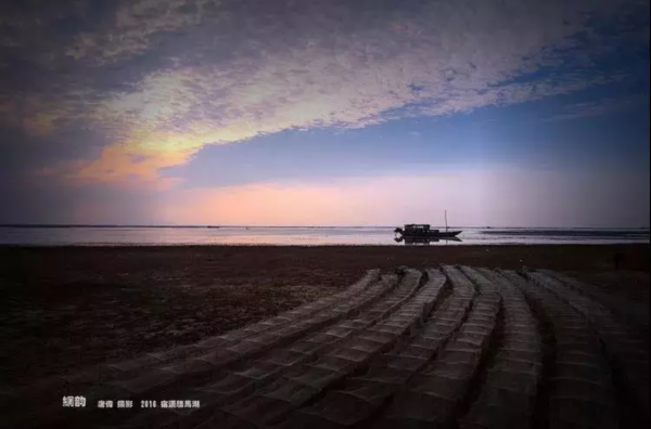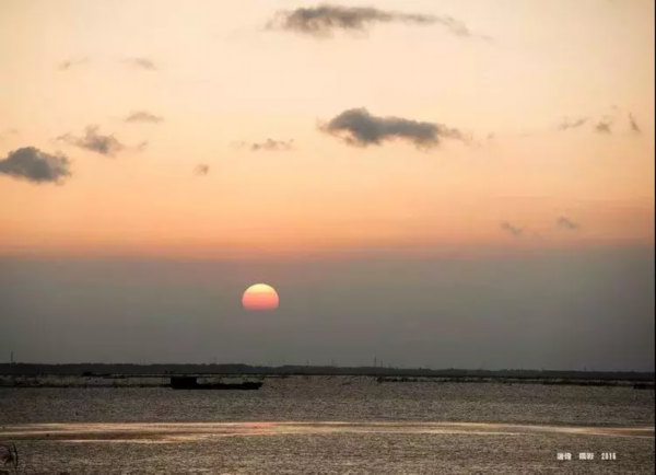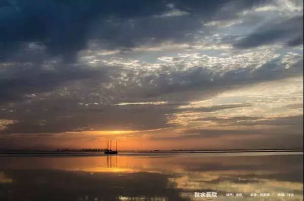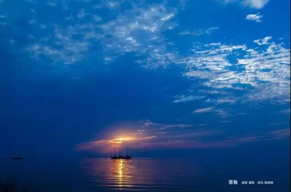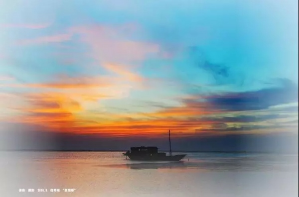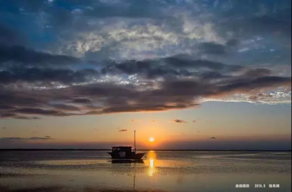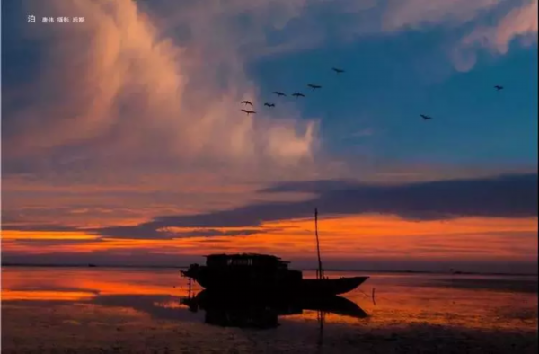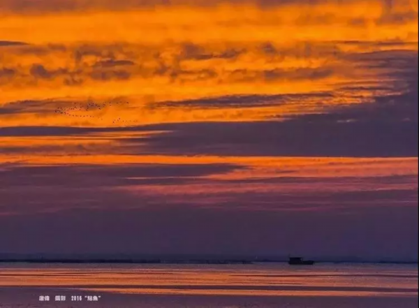 一幅层次分明的油画,静泊的渔船,行进的雁阵,一静一动,在辽阔的晚霞背景下,构成了画面永恒的剪影。
