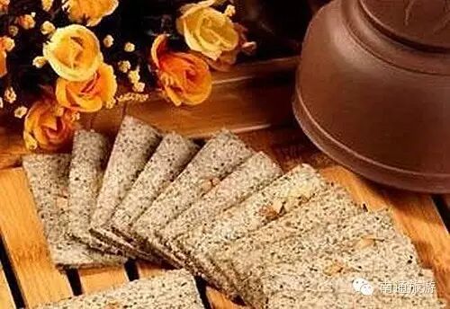 南通嵌桃麻糕,选用芝麻粉、白糖、炒米粉及核桃仁等原料,精工细作而成。每斤两条,每条五十片上下,片片色泽金黄,嵌桃均匀,香、甜、松、酥。干吃,酥而甜,有一股浓郁的芝麻清香,泡食,香味四溢,爽口而不腻。