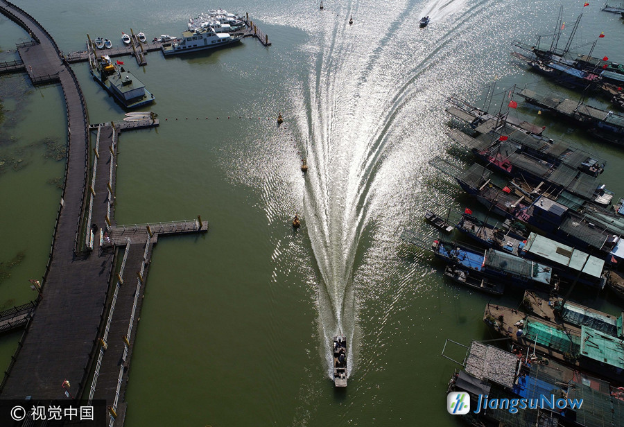 Photo taken on Oct 8 shows fishermen delivering fresh aquatic products on Hongze Lake, in Huai’an of Jiangsu province. October witnesses the harvest season for aquatic products.