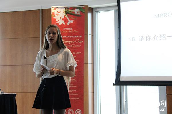 人民网华盛顿10月29日 “‘上有天堂,下有苏杭’的‘苏’指的是哪个城市?”“中国古代修建长城的目的是什么?”“江苏特产的茶叶是哪种?”当地时间10月29日,华盛顿地区“江苏杯”中文演讲比赛在乔治·华盛顿大学艾略特国际关系学院举行,比赛环节不仅有备稿演讲,还包括即兴回答和即兴演讲。