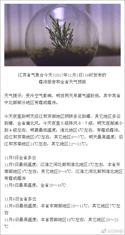 “你好,我是偏东路径的冷空气,最近挺想大家的,所以就迫不及待地从东北那边进来了。一个没忍住,给吉林长春带来了今年入秋以来的首场降雪,虽然比往年稍晚了一些。除了东北,我计划的行程是这样的:今天,大风‘突袭’江苏,周末骤降6℃冻哭你!所以赶紧的,你们该加衣服加衣服,别等我来敲门啊。”