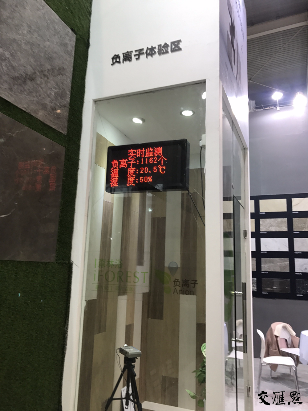 在冠军瓷砖的展台处,有个极为特别的密闭小空间,工作人员向记者介绍,这个透明玻璃房是个“测试间”,专门测试新产品——负离子瓷砖。记者看到玻璃房外挂着一个实时监测屏,显示着空间内的负离子数,以及温度、湿度。