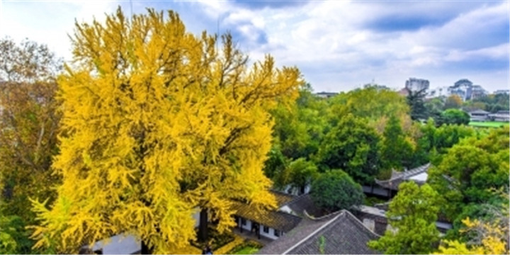 昨天一早,史可法纪念馆工作人员陆维德就发现,两棵古银杏已是落掉了很多叶子,“跟往年一样,天冷的时候,只要起大风,叶子就哗哗落下来。”不过,总体来看,今年的落叶有点早,过去有些年份到11月底叶子还没怎么落。因为下过雨,银杏的落叶不特别亮,但落在黛色屋瓦和青灰色的地板砖上,依然有着鲜明的对比。