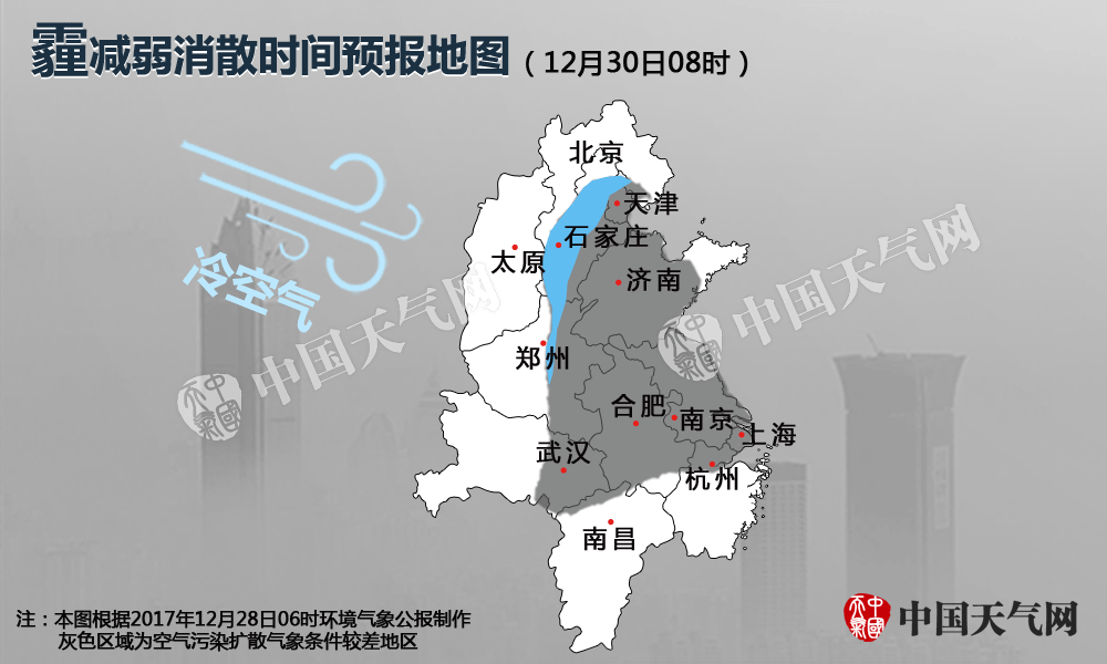 本次霾(2017年12月28日-30日)过程减弱消散预报图。(稿件内图片来源:新华社、中国天气网、视觉中国)