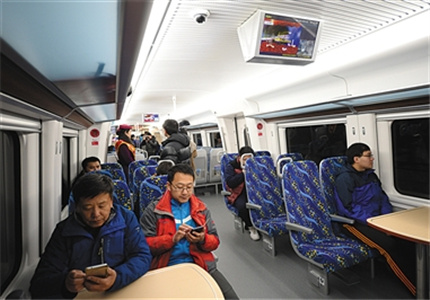 5分钟后列车发车,有不少人开始拿出手机上网,“京通号”动车组内也有供乘客免费连接的WiFi,只需加入名为BJSJTL-WiFi的网络,注册过程不超1分钟。