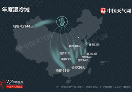 南方的冷是“魔法攻击”,气温低加上湿度大,直接冷到骨子里。2017年度湿冷城中,贵阳、长沙、成都等南方城市上榜,可谓意料之中。而意外上榜的北方城市乌鲁木齐有独特的原因,不时造访的印度洋水汽在天山的抬升下制造降雪,湿度跟着蹭蹭上升,在年度湿冷城占一席之地。