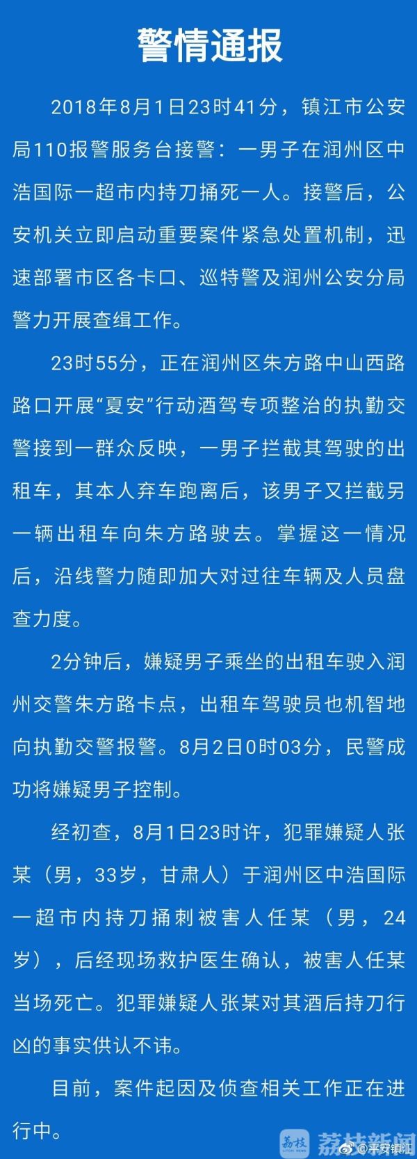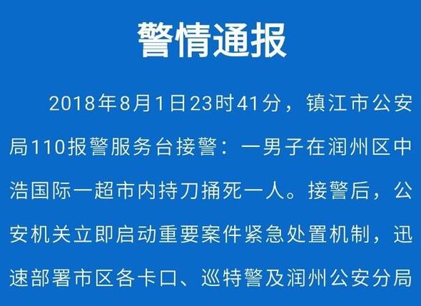 8月1日23时41分,镇江市公安局110报警服务台接警:一男子在镇江市润州区中浩国际一超市内持刀捅死一人。接警后,公安机关立即启动重要案件紧急处置机制,迅速部署市区各卡口、巡特警及润州公安分局警力开展查缉工作。