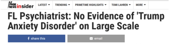 立场偏向特朗普的FOX电视台除了几篇报道,大意都是说,“特朗普焦虑症”不是病,没证据显示它正大面积爆发↓
