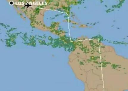 航管图显示,蔡英文专机离开洛杉矶后并未循太平洋海岸南下、经墨西哥前往中美洲,而是沿着美墨边境线平行美国一侧,经得州飞往迈阿密航管区。该飞机将经古巴上空转往委内瑞拉东侧加勒比海,由圭亚那与苏里南之间空域进入巴西东北部领空,最后绕过玻利维亚飞往目的地亚松森机场。