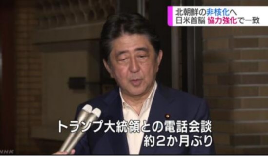 报道称,安倍22日晚9时30分左右,在首相官邸与特朗普进行了约40分钟的电话会谈。会谈结束后,安倍接受记者团采访时表示,会谈中与特朗普分析了最新的形势并对今后的对朝方针进行了商讨。日美双方就实现朝鲜半岛完全无核化的方针完全一致。