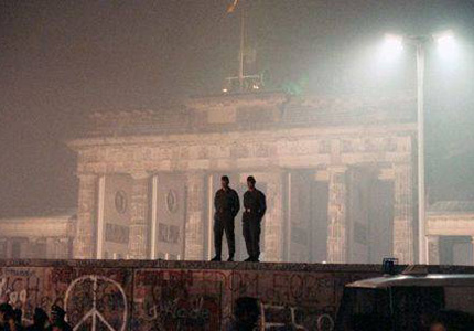1989年11月的档案照片,两名东德边防士兵在柏林墙上巡逻,背景是勃兰登堡门。(图片:AP/Jockel Finck)