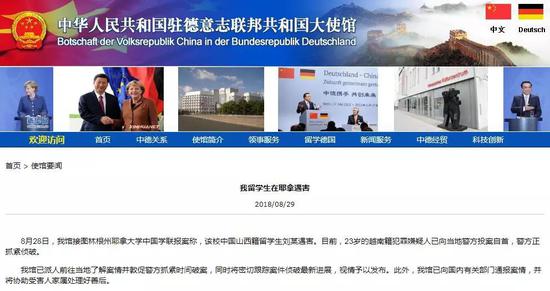 8月28日,中国驻德国大使馆接到耶拿大学中国学联报案称,该校中国山西籍留学生刘某遇害。