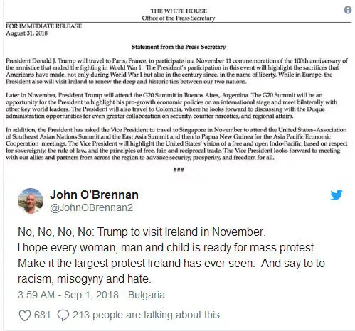 网友约翰·布里南:不不不不,特朗普11月要访问爱尔兰。我希望每一个男人、女人、孩子都做好大规模抗议的准备,搞一场爱尔兰历史上最大规模的示威,同时对种族歧视、不尊重女性和仇恨说不!↓