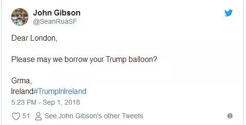 网友约翰·吉布森:亲爱的伦敦,我们可以借用下特朗普气球吗?爱尔兰。