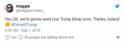 “嘿,英国,我们急需用一下你们那个特朗普东东,多谢,爱尔兰敬上”。网友MAGGIE说↓