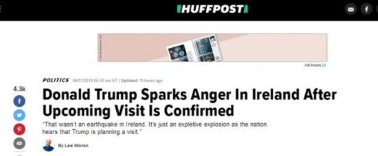 美国《赫芬顿邮报》说,唐纳德·特朗普的行程一经确定,就在爱尔兰激起愤怒。“当爱尔兰这个国家听说特朗普要来,确实没有引发地震,而是引发了脏话大爆炸”。↓