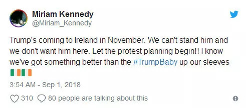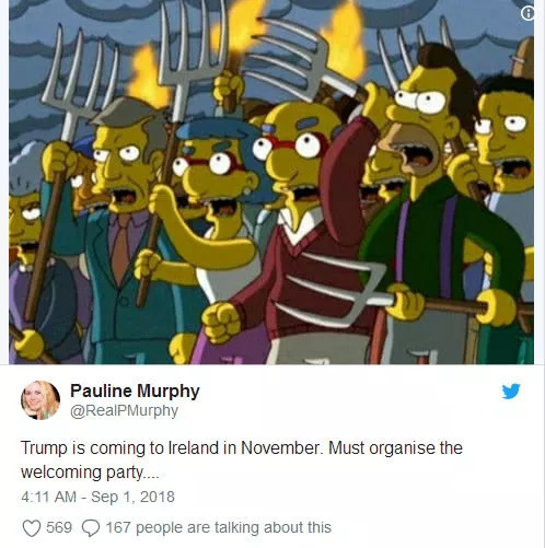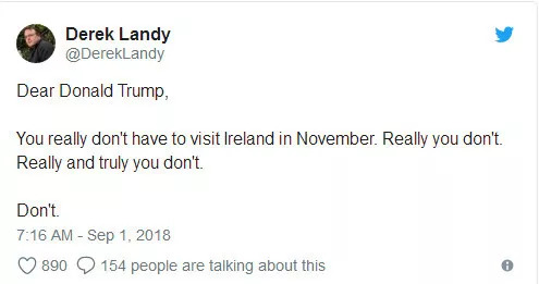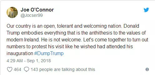 网友乔·康纳:我们是一个开放、宽容、好客的国家。但唐纳德·特朗普这个人所展现的一切都与现代爱尔兰价值观对立。他真的不受欢迎。
