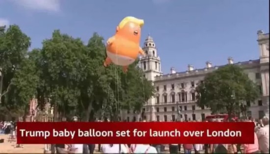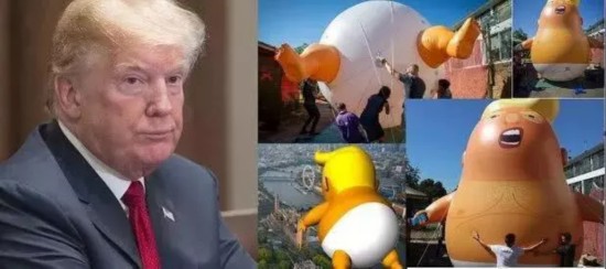 解释一下,“特朗普宝宝”是伦敦人7月时为抗议特朗普访问放飞的热气球,它长这样↓