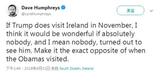 下面这个来自都柏林南城的网友说,特朗普11月来爱尔兰,假如能做到谁都不见他,谁都不见,与当年奥巴马来的时候的情景完全相反,那将十分精彩。↓