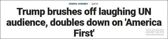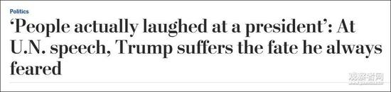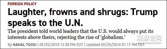 POLITICO新闻网:美国总统在联合国的第二次演讲再次强调了特朗普的“美国优先”理念,他也就毫不忌讳地告诉全世界,“美国利益是凌驾于任何利益之上的”,并没有注意到全世界的(指大厅内的各国代表)嘲讽、耸肩、皱眉。