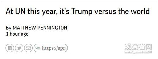 美联社直接以《今年在联合国,特朗普与世界为敌》为题,讽刺特朗普开创了当今社会的一种新的国与国之间的“分裂形势”,这不再是意识形态,不再是贫穷或富有,不再是东西间的抗衡,而是多边主义和单边主义的对立。