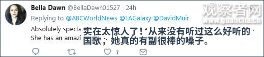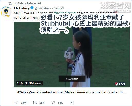 银河队官推也在23日转发了玛利亚演唱的视频,称这是“Stubhub中心有史以来最精彩的演唱之一”。