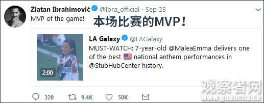 赛后,他也发推赞玛利亚是“本场比赛的MVP”。即将37岁的伊布在比赛中一传一射,带领球队以3-0战胜对手,使球队依然保有进入季后赛的一线希望。