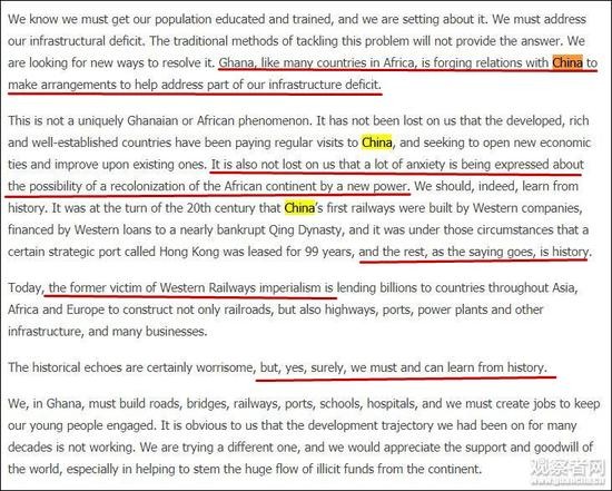 “这不是一个独特的加纳或非洲现象。我们十分清楚,发达的、富裕的且十分成熟的国家,会定期访问中国,寻求发展新的经济关系、并加强旧有的经济关系。我们也十分清楚,有许多焦虑,说非洲大陆可能会被一个新的大国再次殖民。确实,我们需要从历史中吸取教训。那是在20世纪之交,中国的第一条铁路是由西方公司建造的,西方国家向几乎破产的清王朝提供贷款。也正是在这种情况下,一个叫做香港的战略港口被租赁了99年。凡此种种,正如俗话所说,就是历史。”