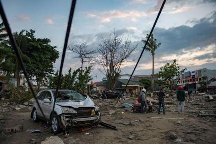 9月29日,在印度尼西亚中苏拉威西省首府帕卢市,人们查看受灾情况。