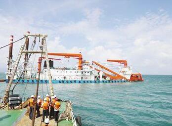 据陈文锋介绍,一期项目的疏浚工程量不低于1000万立方米,预计吹填造陆面积为100万平方米,“相当于在海面上填了140个足球场,将海岸线前移了4公里”。如此浩大的疏浚吹填工程在柬埔寨还从未有过。为了确保工程质量,“顶峰浚”号绞吸船组和4000米的吹填浮管都是从中国大连直接运至贡布港口。和船组一起来的,还有30多名经验丰富的船员。