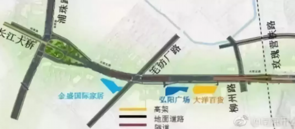 大桥北路快速化改造项目南起浦珠路(江山路)桥北互通,主线以地道形式下穿毛纺厂路,以分幅高架形式上跨柳洲路和梅桂营铁路,最后于泰山新村交叉口以南落地,北至江北大道;