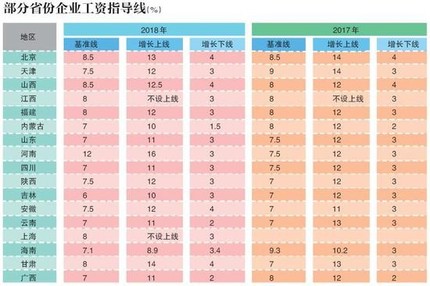 同时,对比今年与去年各省份工资指导线水平,从基准线看,天津、山东、四川、内蒙古、吉林、广西、海南等7省份均较2017年有所下调。而山西、河南、陕西、安徽、甘肃等5省份对基准线进行了上调,河南上调幅度最大,由去年的7.5%上调至今年的12%。
