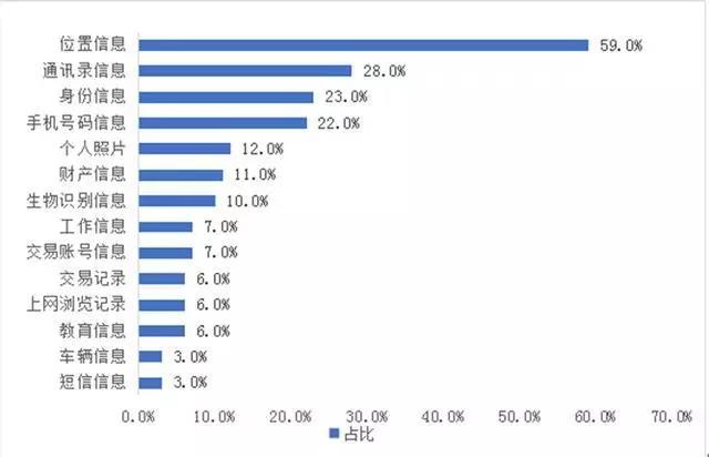 在收集个人信息方面:100款App中多达91款App列出的权限存在涉嫌“越界”,即普遍存在涉嫌过度收集个人信息的情况。59款App涉嫌过度收集“位置信息”,28款App涉嫌过度收集“通讯录信息”,23款App涉嫌过度收集“身份信息”,22款App涉嫌过度收集“手机号码”等。除此之外,用户的个人照片、个人财产信息、生物识别信息、工作信息、交易账号信息、交易记录、上网浏览记录、教育信息、车辆信息以及短信信息等均存在被过度使用或收集的现象。