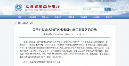 不仅如此,江苏省生态环境厅网站,日前也发布了关于对拟命名为江苏省省级生态工业园区的公示。