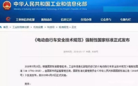 今年的5月17日,由国家市场监督管理总局、国家标准化管理委员会批准发布的、新修订的《电动自行车安全技术规范》出台,将于2019年4月15日起实施。