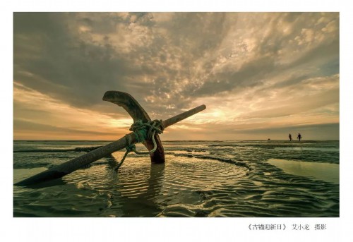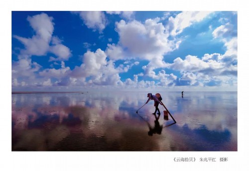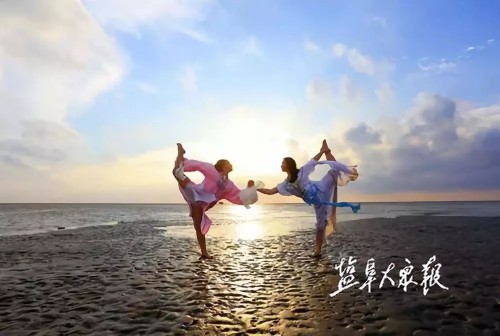 《蓝天白云与滩涂的对话》这幅作品拍摄于2017年9月底,地点在东台条子泥风景区。透过构图简洁、色彩明亮的图片,可以看见两名身着淮剧古装的女孩,单腿站立在滩涂上,弯曲身体向前拉伸,十指相扣迎面微笑。她们在蓝天白云的映衬下,端庄优雅得犹如两只仰天长鸣的丹顶鹤。别看画面十分唯美,拍摄之初,顾炳龙可没少花心思。