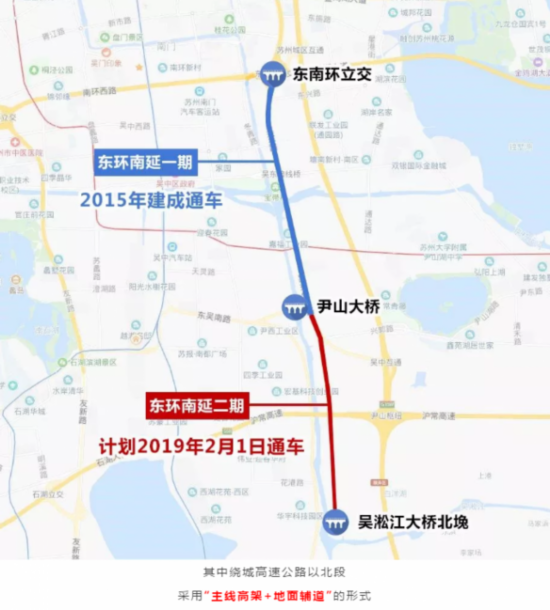 2、东环南延工程三座东西向跨运河桥(南湖路地面桥、吴中东路桥和石湖东路桥)计划2019年6月底前完工通车;