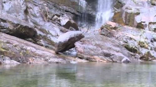 记者现场看到,这个石崖起码有超过三十米的高度,当时这头野猪就是从上面滚下来,掉进了水潭里,可能因为在滚下来的时候,它与石头发生撞击,所以当时它是没有知觉了,见状工作人员将其捞起来,然后拖到瀑布下方旁边的石坡上。