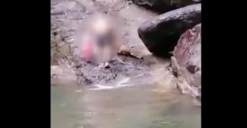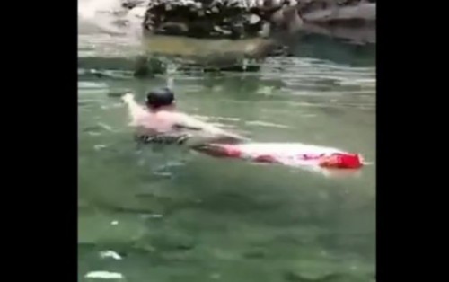 记者在视频中看到,一名男子小心翼翼的靠近地上的野猪,并用脚试探了一下,眼看野猪一动不动,便将野猪翻了过来,并用袋子装起来,从水里拖向岸边。
