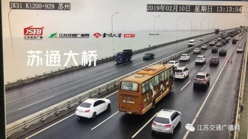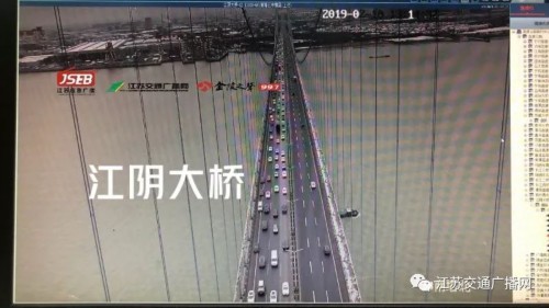 江阴大桥,往上海方向,车辆主要是从广靖段的广陵枢纽一直缓行到了北引桥路段,现场通行非常缓慢;