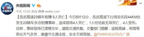 ●今日5时12分,岳武高速下行线安庆段44KM处(武英高速安徽连接段)发生23辆车多点相撞事故。造成现场4人坠桥身亡,1人经抢救无效死亡,4人受伤(无生命危险)。