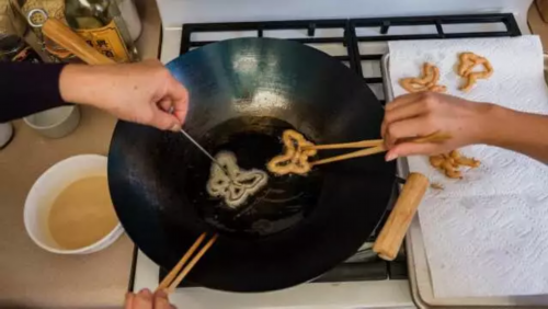 ▲林奶奶和女儿一起炸蝴蝶酥