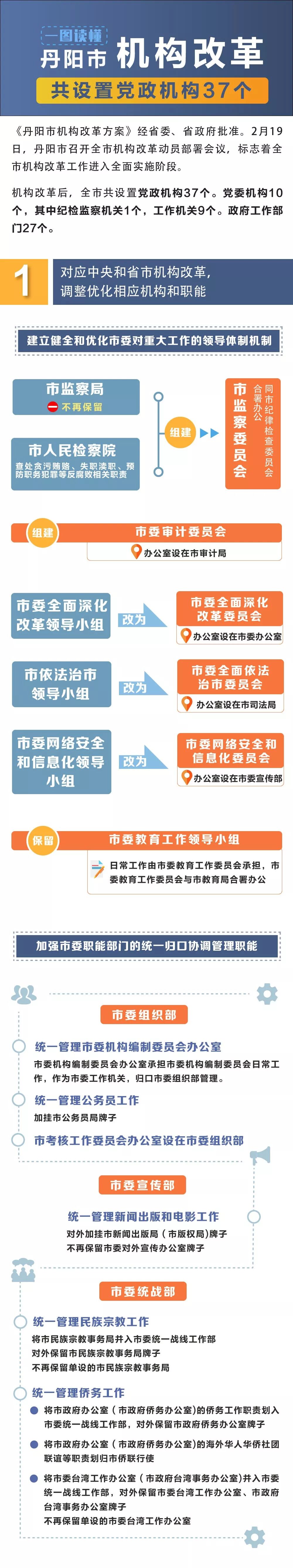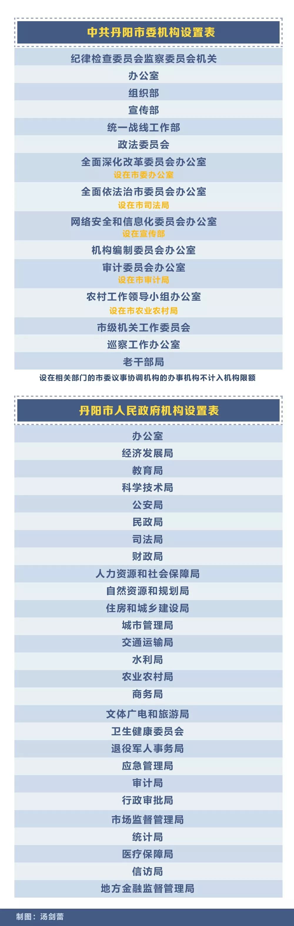 机构改革后,全市共设置党政机构37个,均为正科级。其中,党委机构10个,包括纪检监察机关1个、工作机关9个;政府工作部门27个。与机构改革前相比,撤销机构17个,组建机构10个,保留机构27个。净减少正科级行政机构7个,其中,市委机构净减少4个,市政府机构净减少3个(其中环保部门因垂管体制改革不再作为丹阳市政府机构,改革前后均未计数)。