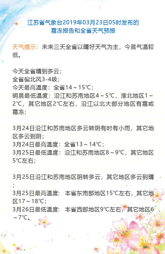 未来三天全省以晴好天气为主,今晨气温较低。今天全省晴到多云;偏北风3-4级;今天最高温度:全省14-15℃;明晨最低温度:沿江和苏南地区4-5℃,淮北地区1-2℃,其它地区2℃左右,沿江以北大部分地区有霜或霜冻。
