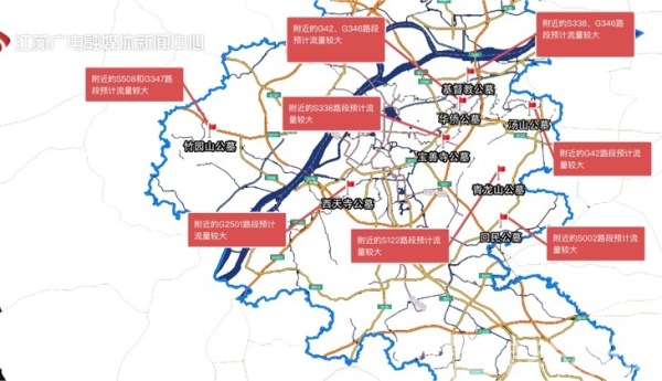 G312宁镇公路南京段四桥匝道口(衡阳寺路口处),南京往苏北方向过江,出行高峰时间清明节第一天6:00-10:00,清明节第三天14:00-19:00。