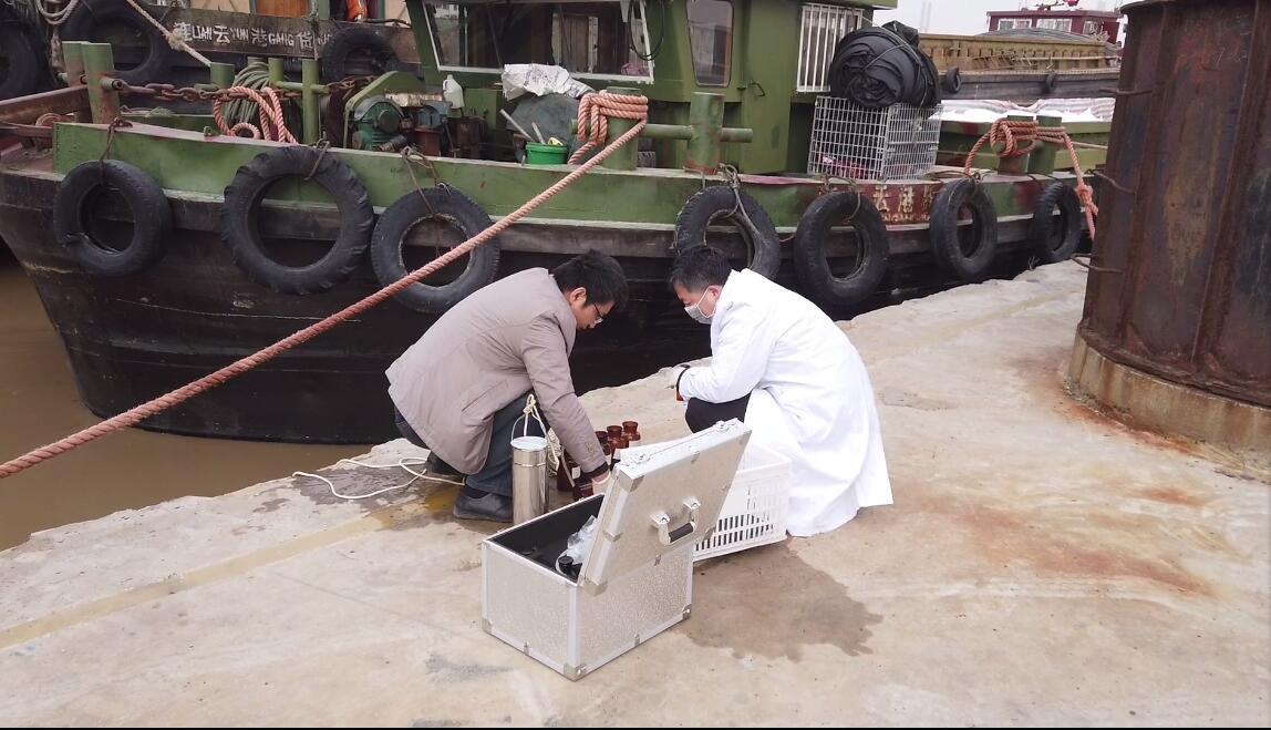 今天上午8点,我苏网记者跟随江苏省环境监测中心的工作人员来到距离爆炸事故现场下游约3公里处的地表水质监测点,这里也是盐城灌河的入海口,工作人员在此取样对水质进行监测。