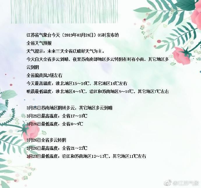 今天(3月24日)白天全省多云到晴,夜里苏南南部地区多云转阴有时有小雨,其它地区多云到阴,全省偏南风3级左右,今天最高温度:淮北地区15~16℃,其它地区14℃左右,明晨最低温度:淮北地区4~5℃,沿江和苏南地区9~10℃,其它地区7℃左右。