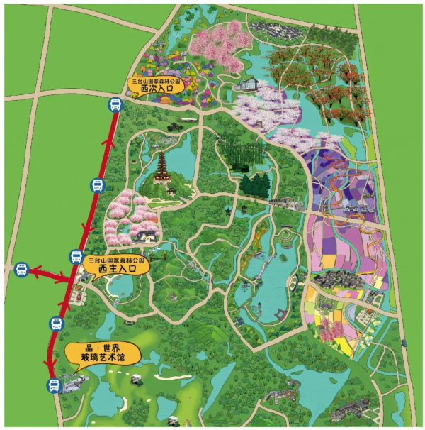 接驳区间:从三台山西次入口→☆西主入口→晶世界玻璃艺术馆→☆西主入口→三台山西次入口(全天班车循环接送,招手即停)