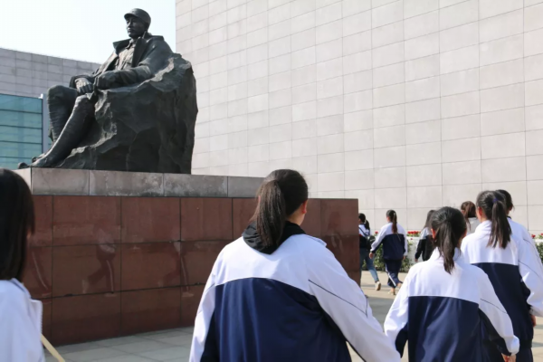 同学们排着整齐的队伍瞻仰彭将军铜像