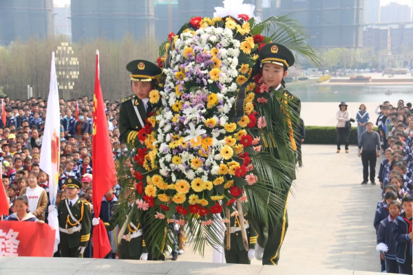 学生代表敬献花篮表达对彭雪枫将军的深深敬意